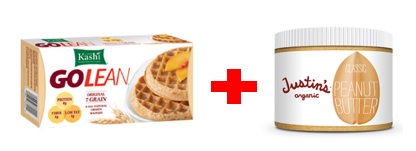 1.) Whole wheat frozen waffle peanut butter sandwich - Toast two whole wheat waffles and add a layer of peanut butter (or almond butter) to the top surface of each piece. Then, assemble like a sandwich. You can substitute nut butters with regular butter and jam or apple butter. When making this recipe for Emma and Reed, I personally like to use Kashi's GOLEAN Waffles (they contain 8 g of protein and 6g of fiber!) combined with Justin's Organic Peanut Butter.