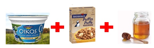 2.) Yogurt bowl - Combine low-fat and/or organic yogurt with whole grain cereal and then simply add some honey to sweeten. My personal favorite combination for this one is Stonyfield's Oikos Organic Greek Yogurt combined with Barbara's Puffin cereal (Puffin brand comes in tons of yummy kid friendly flavors!).